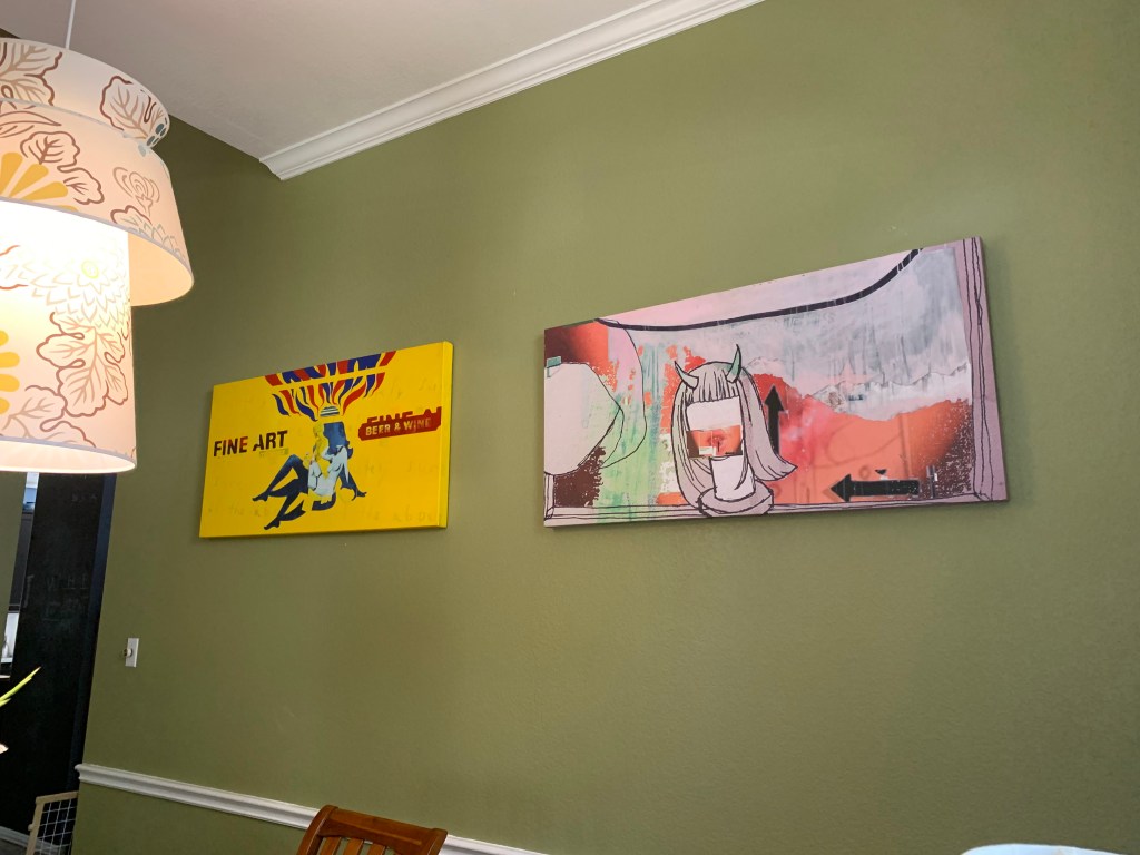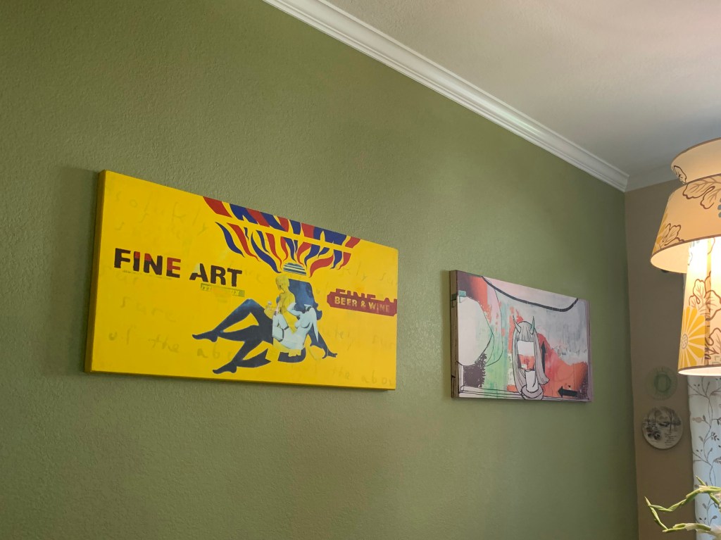 I have a moving sale update. Just received these pictures from happy customers, Todd & Erin Ziaja. My paintings, Get It While You Can, and Reliable are now theirs, and hanging up in their home in Austin, Texas. I am always very grateful when my work is displayed on the walls of someone’s home. I also appreciate seeing how they’ve chosen to display my work. It feels great.