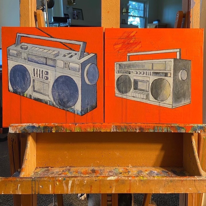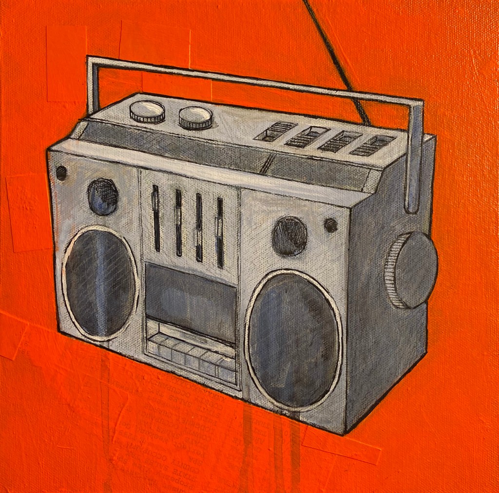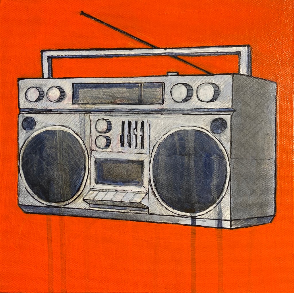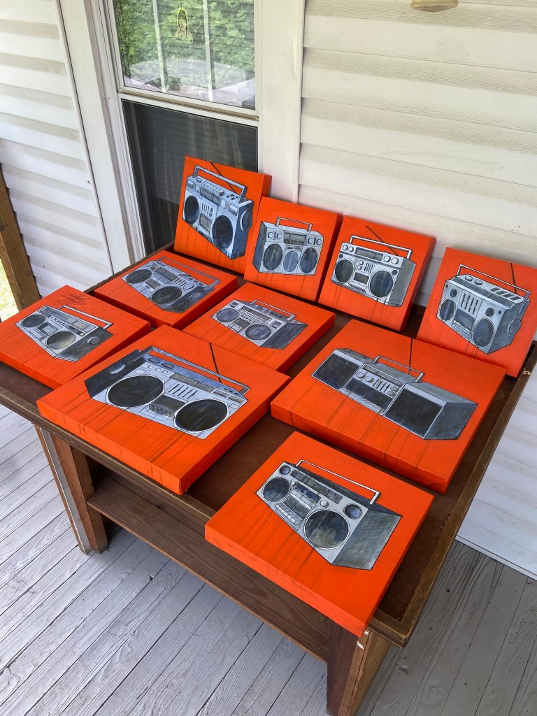 I am rolling along on my new series of boombox paintings. Got a lot done today. Feeling good about that. Here’s a few pictures of all that happened today.