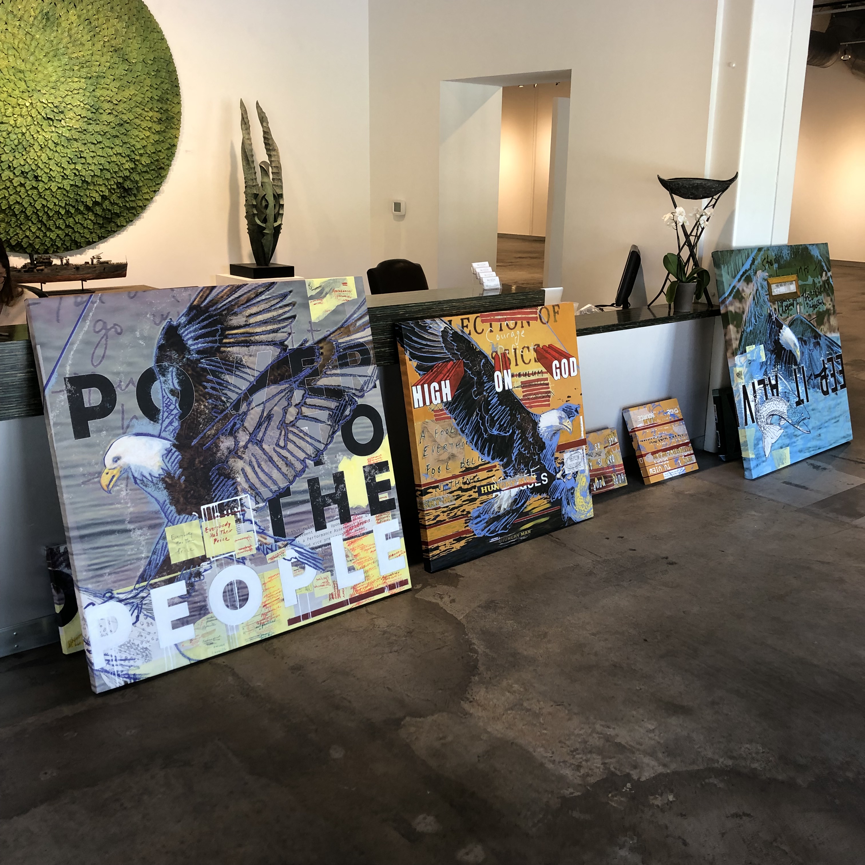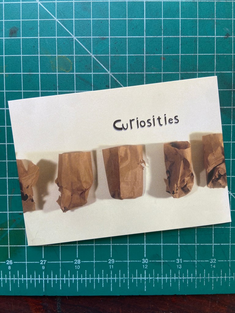 Curiosities was one of these group exhibitions, and it occurred twenty years ago today. This exhibition was different than our usual exhibitions because it featured art made by cats. That’s right, all artwork in the exhibition was presented as a cat’s creation. Included were titles and statements translated and written by each cat’s owner. We pushed the joke as far as we could. Was all of the artwork really made by cats? No, only a couple of pieces were, most notably, the installation work “Five 40’s” featured on the postcard. It was created by Sweet Jimmy, who was one of Ken and Amy Miller’s cats.