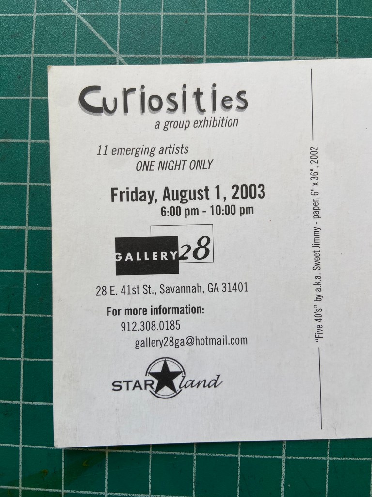 In 2003, I was a graduate student in Savannah, GA at the Savannah College of Art and Design (SCAD). That year we often held group exhibitions around the corner from my place at the house where my friends Magen, Dana, and Michael lived. On the first Friday of every month, we would quickly transform their common living space into a gallery space, and 28 E. 41st Street became Gallery 28.