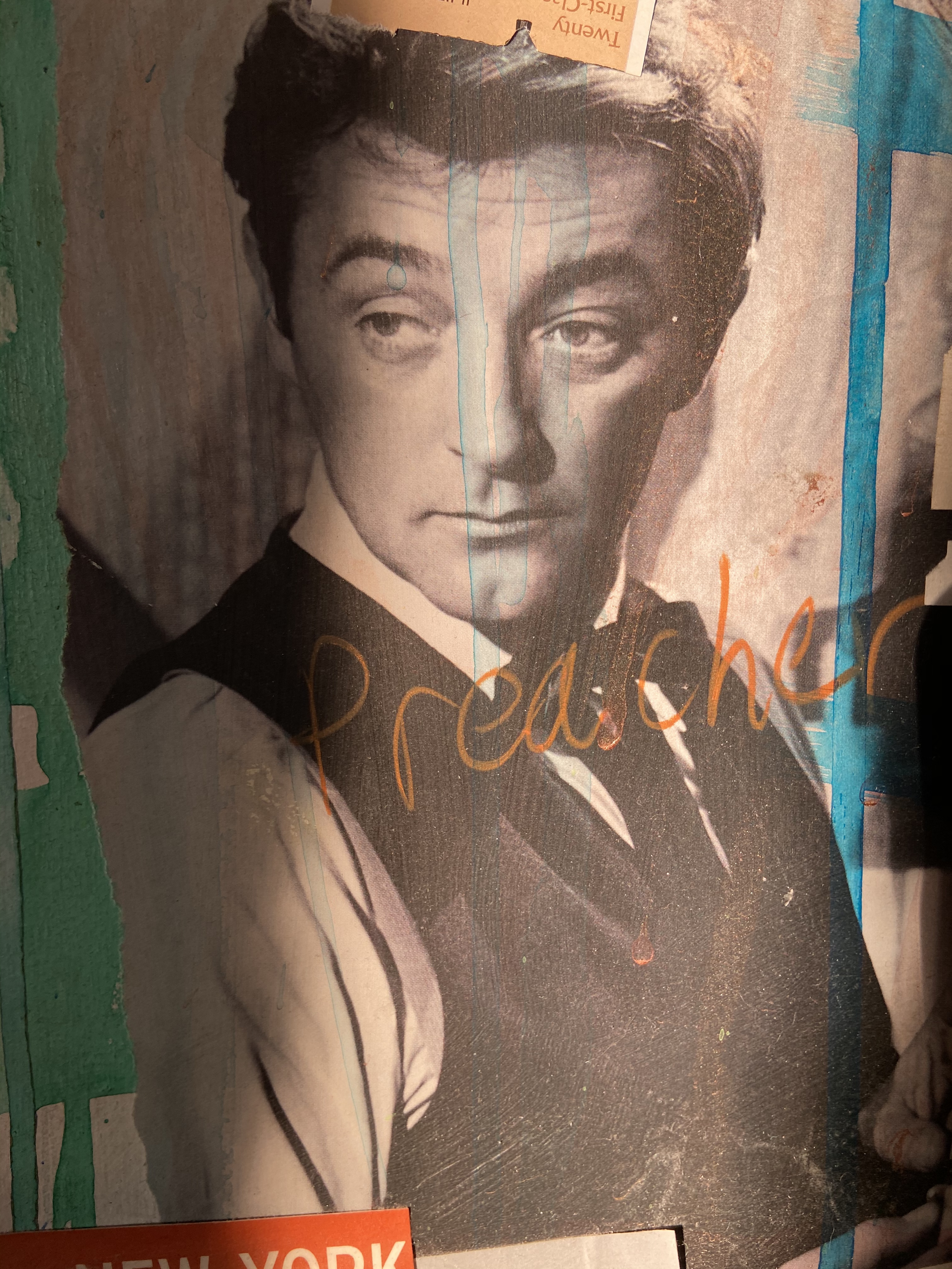 I was working on class preparations in my studio this morning when I noticed the sunlight highlighting a section of a collage I made many years ago. Robert Mitchum from The Night of the Hunter. There it is. Another valuable nugget from the mine. Something I can use, right now.